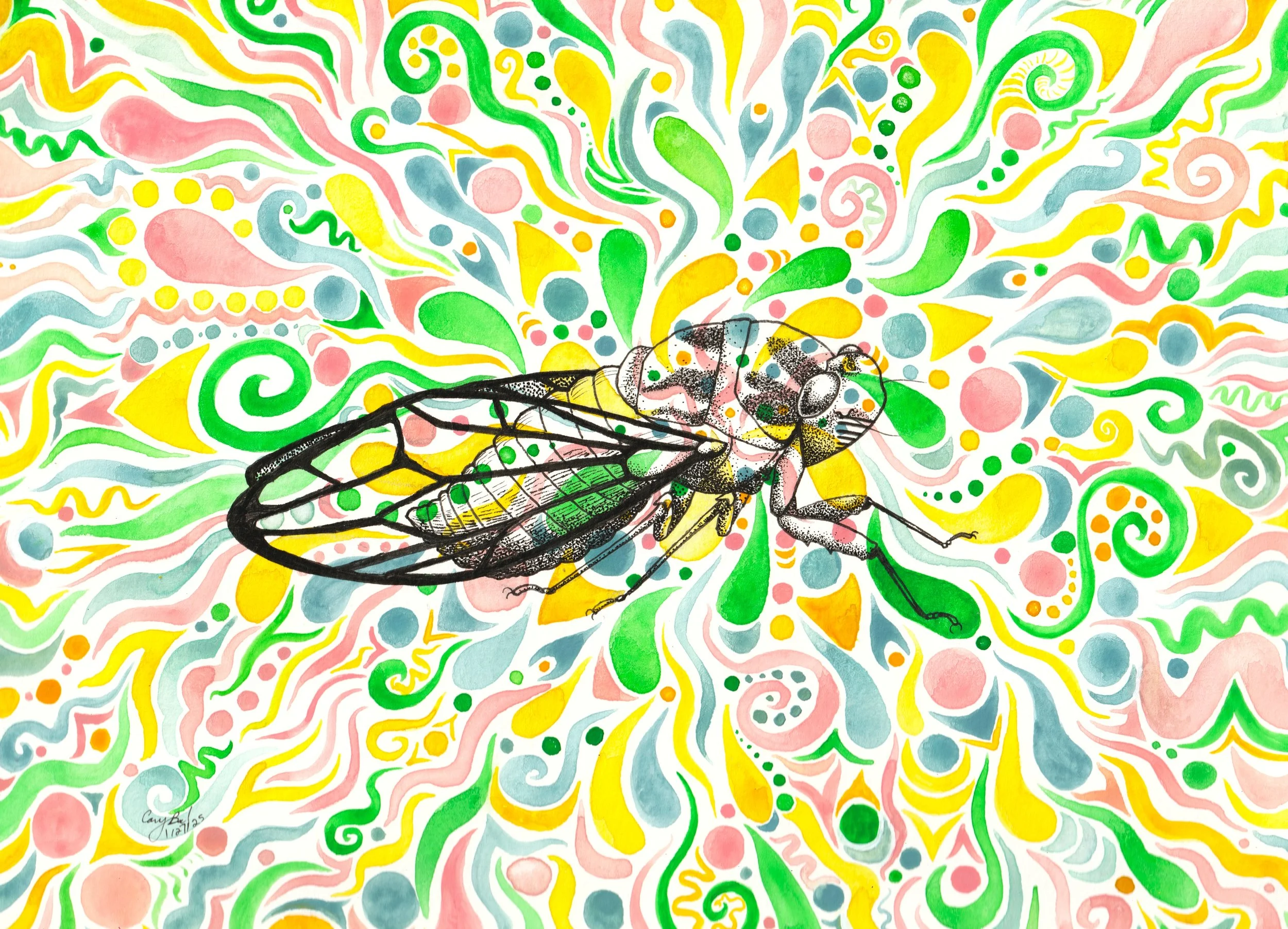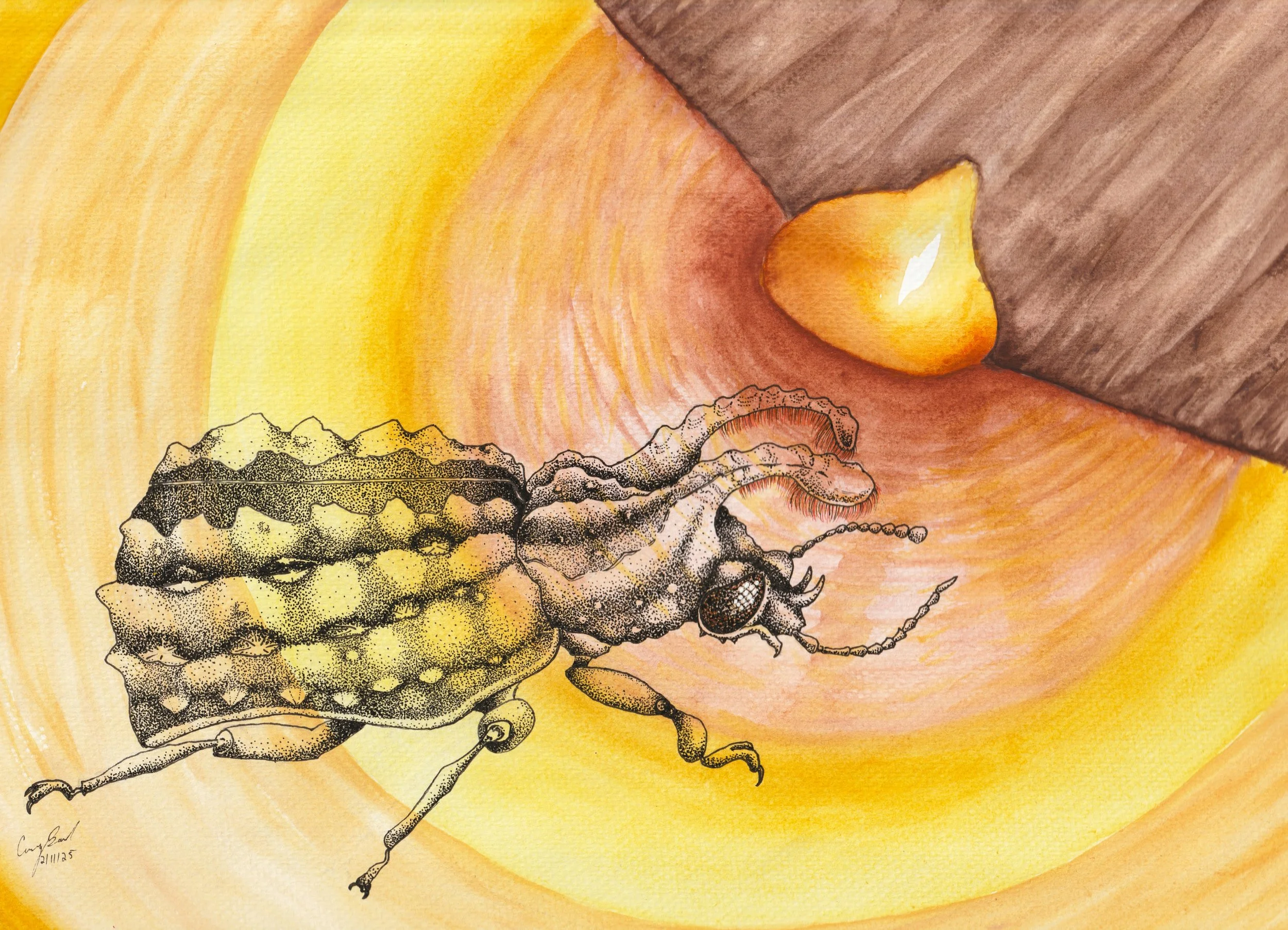 Casey blends stippled ink drawing, colored pencil sketches, delicate watercolor washes, and surreal acrylic painting to create compositions that are both grounded in realism and imbued with imaginative depth. Whether studying the fragile transparency of a mosquito’s wing or the bold structure of a beetle’s elytra, her art highlights the wonder and complexity of even the smallest living things. Through careful shading and thoughtful composition, each piece offers a quiet celebration of life’s intricacy.